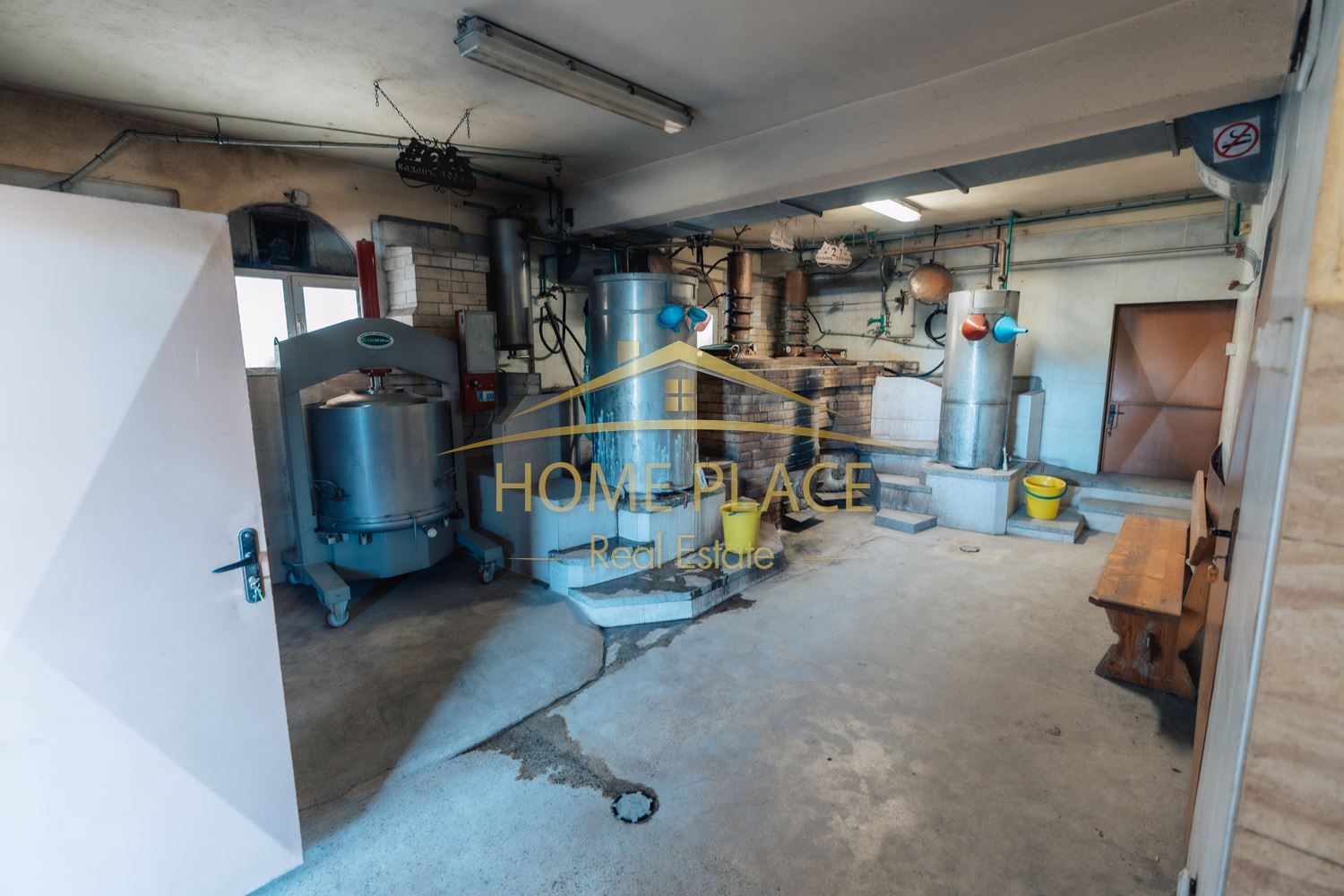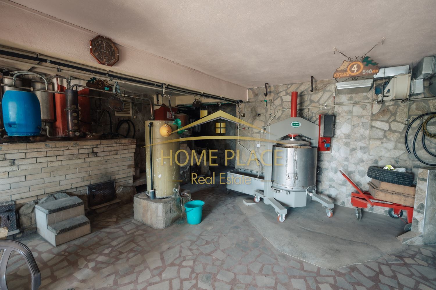 Етаж 1 – складови помещения, битовка и две напълно оборудвани помещения за производство на ракия с казани и всички необходими съоръжения.