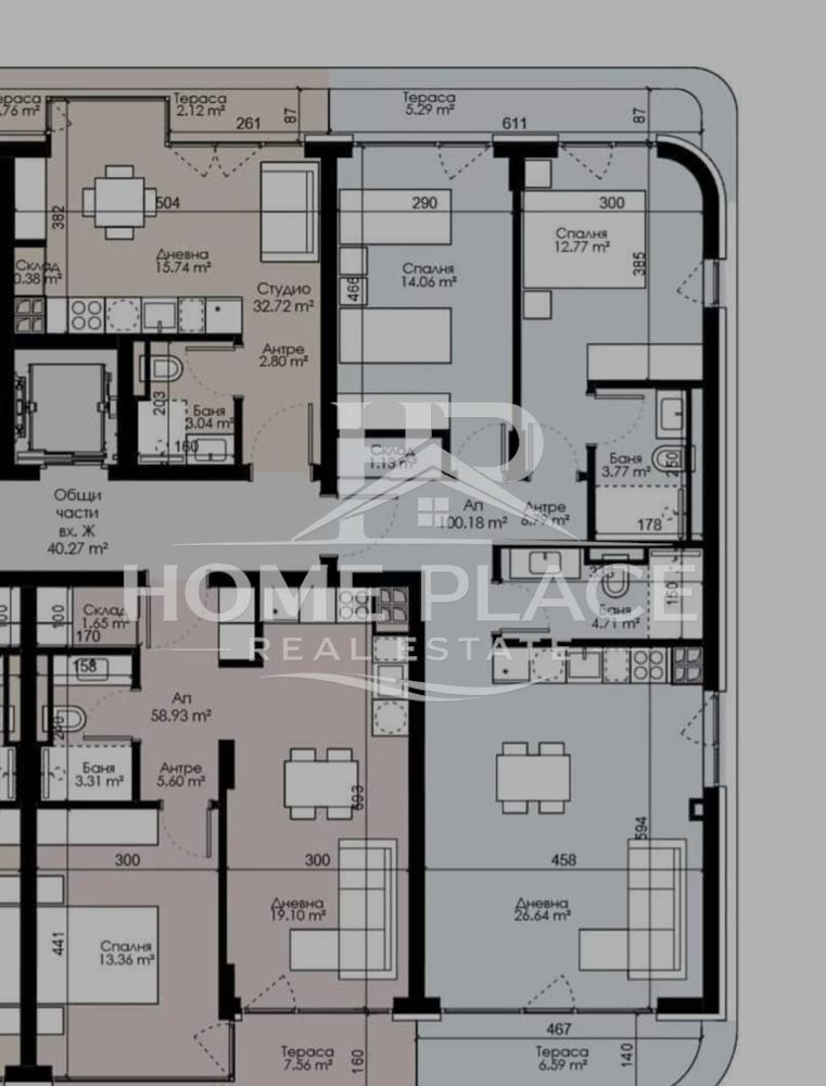 -РАЗПРЕДЕЛЕНИЕ: Всекидневна с кухненски бокс - 26.64 кв.м. на две изложения с излаз на тераса - 6.56кв.м. , родителска спалня със собствена баня и тоалетна - 16,54 кв.м., втора спалня - 14,06 кв.м. с обща тераса - 6кв.м.; баня с тоалетна - 4.71 кв.м., антре и скалд - 7 кв.м.
